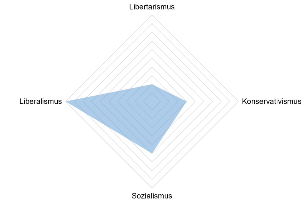Aus diesen Gründen habe ich die POLID-Skala entwickelt, mit der Befragte Punkte für die vier zentralsten Ideologien der westlichen Länder sammeln (Ökonomischer Libertarismus, Konservativismus, Sozialismus und Liberalismus). Diese können in Spinnennetzen dargestellt werden. Dabei stellt die farbige Fläche jeweils den Trade-off zwischen den vier POLID-Scores dar.